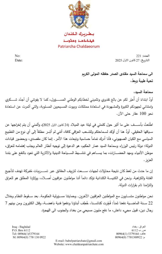أرسل بطريرك الكنيسة الكلدانية، سايكو، رسالة رسمية إلى السيد مقتدى الصدر، أكد فيها عدم وجود أي دعوة للتطبيع السياسي مع الكيان الصهيوني خلال حديثه في ليلة عيد الميلاد (24 كانون الأول 2025).