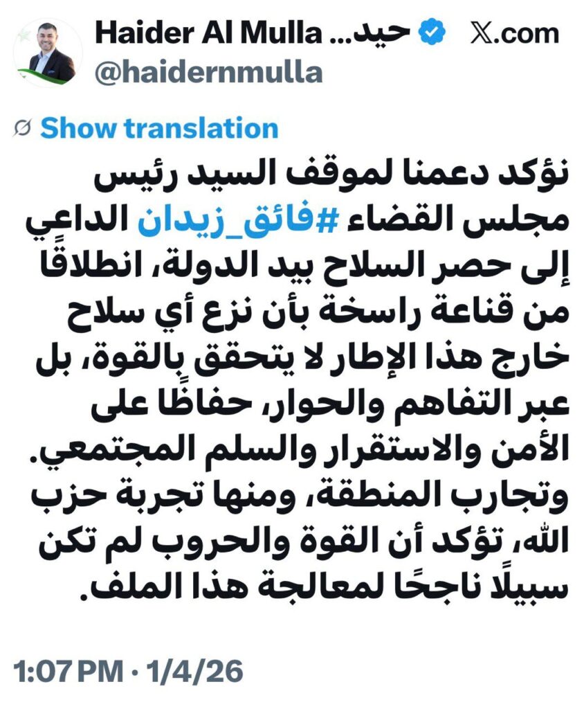 وذكر الملا في تدوينه له، أن “نزع السلاح خارج اطار الدولة لا يتحقق بالقوة، بل عبر التفاهم والحوار، حافظات على الامن والاستقرار”.