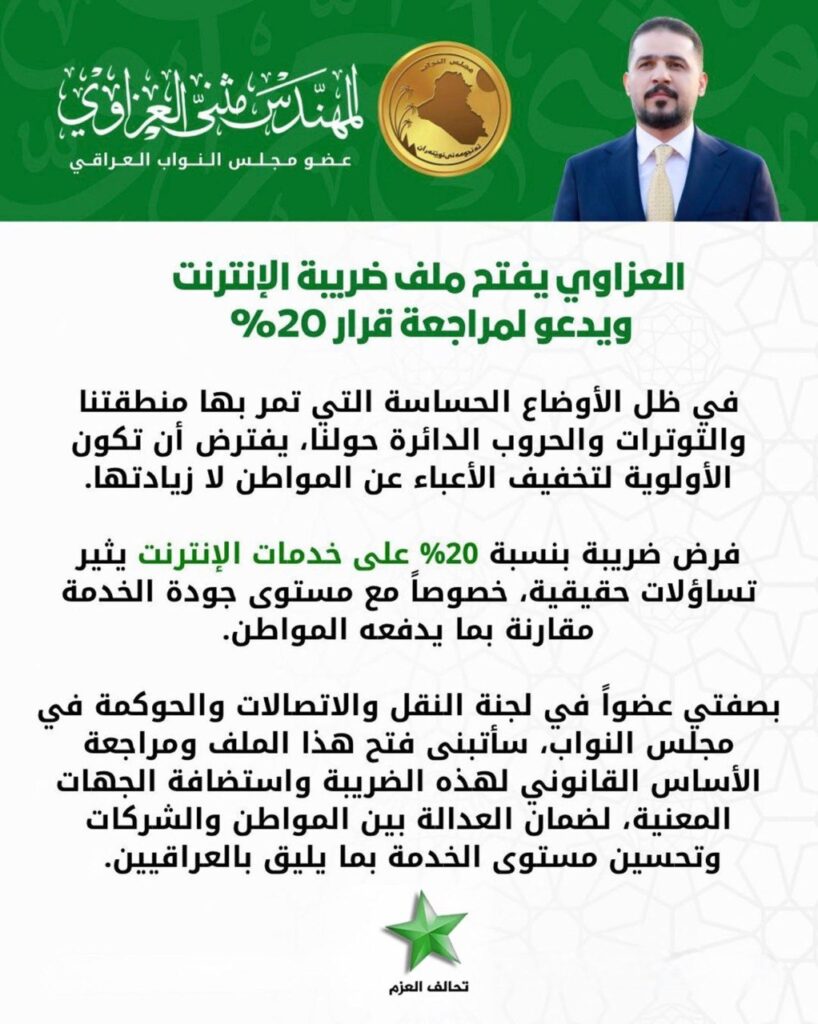 أضاف أن “بصفتي عضواً في لجنة النقل والاتصالات والحوكمة في مجلس النواب، سأتبنى فتح هذا الملف ومراجعة الأساس القانوني لهذه الضريبة واستضافة الجهات المعنية، لضمان العدالة بين المواطن والشركات وتحسين مستوى الخدمة بما يليق بالعراقيين”.