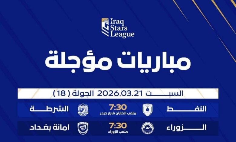 تقام، اليوم السبت، مباراتان مؤجلتان من الجولة الـ18 ضمن منافسات دوري نجوم العراق، حيث تنطلق المواجهتان في تمام الساعة 7:30 مساء في العاصمة بغداد.