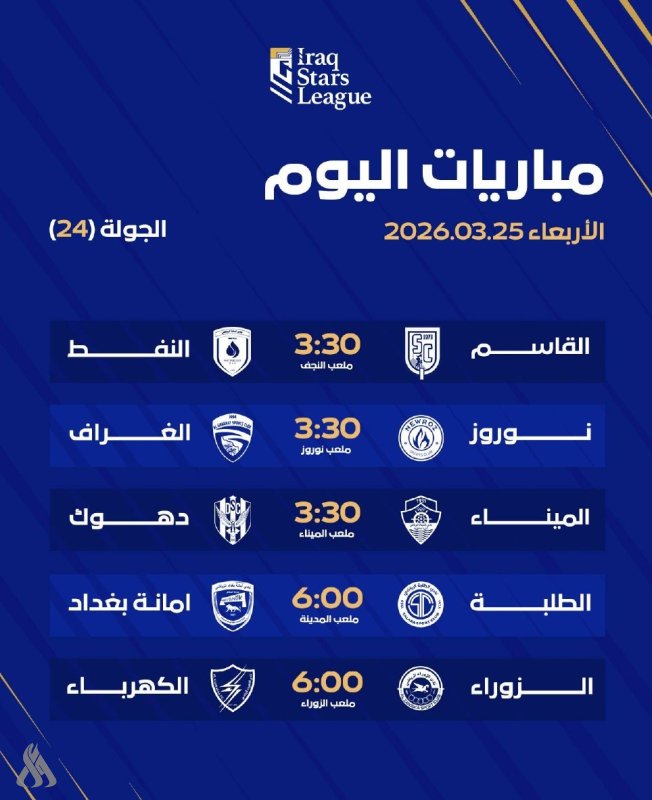 ففي الساعة السادسة مساءً، يلتقي الزوراء على ملعبه بفريق الكهرباء، حيث يسعى النوارس لمواصلة صحوتهم رغم الغيابات، فيما يطمح الكهرباء لاستغلال الظروف والخروج بنتيجة إيجابية. وفي التوقيت ذاته، يستضيف الطلبة فريق أمانة بغداد على ملعب المدينة الدولي، في مباراة مهمة لأصحاب الأرض للحفاظ على موقعهم ضمن المربع الذهبي، مقابل سعي الضيف للابتعاد عن مراكز الهبوط.