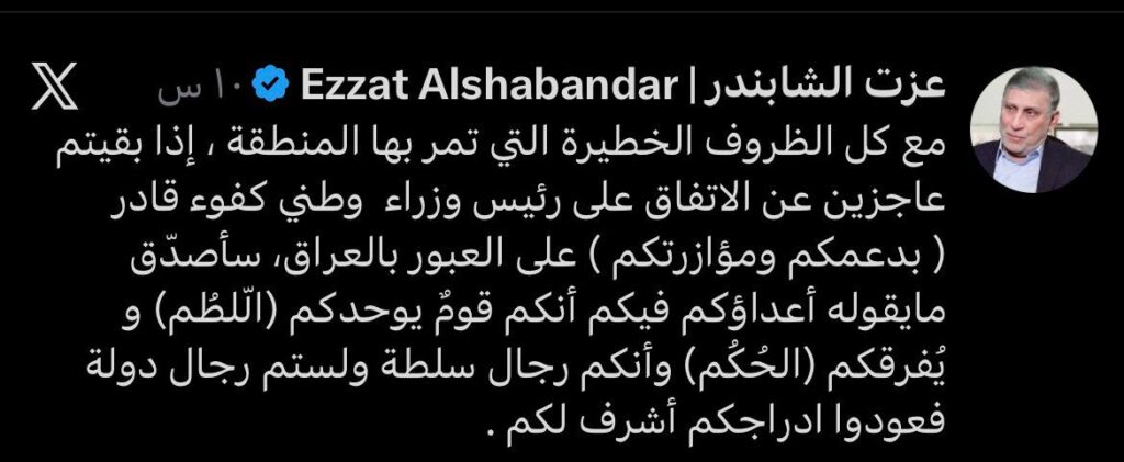والق الشابندر في تدوينة له عبر حسابه، إن “مع كل الظروف الخطيرة التي تمر بها المنطقة ، إذا بقيتم عاجزين عن الاتفاق على رئيس وزراء وطني كفوء قادر ( بدعمكم ومؤازرتكم ) على العبور بالعراق، سأصدّق مايقوله أعداؤكم فيكم”.