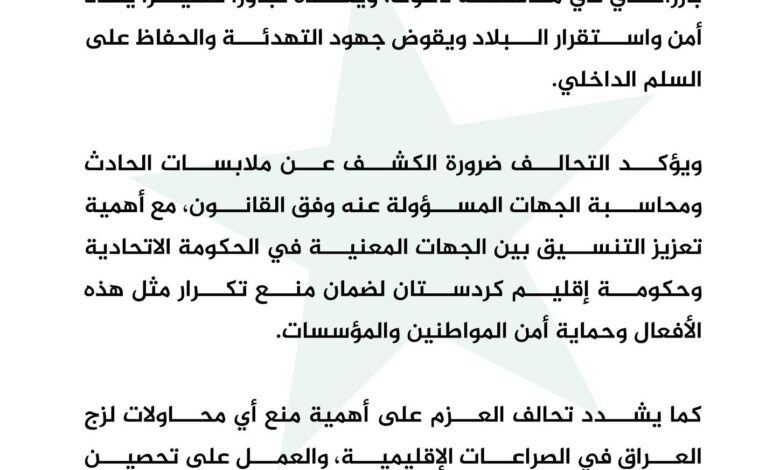 وأكد التحالف في بيان تلقته وكالة ” الناعور برس”، “ضرورة الكشف عن ملابسات الحادث ومحاسبة الجهات المسؤولة عنه وفق القانون، لافتا إلى أن ” أهمية تعزيز التنسيق بين الجهات المعنية في الحكومة الاتحادية وحكومة إقليم كردستان لضمان منع تكرار مثل هذه “.