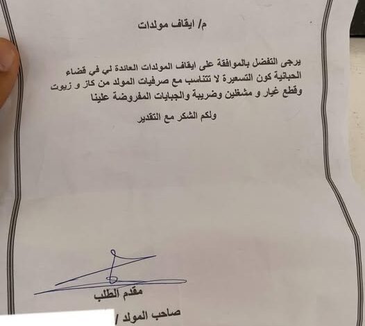 قدم عدد من أهالي المولدات في محافظة الانبار، طلب إلى الحكومة المحلية من اجل ايقاف المولدات يسبب التسعيرة الجديدة.
