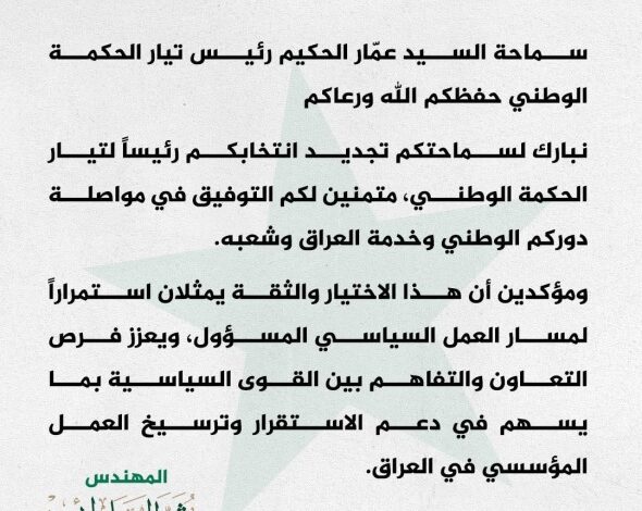 وعدّ السامرائي إعادة انتخاب الحكيم محطة مهمة في مسار العمل السياسي، مع تمنيات بالتوفيق في مواصلة دوره الوطني وخدمة العراق.