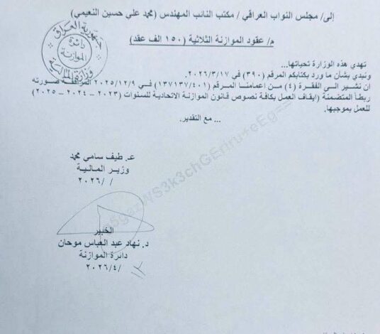 أظهرت وثيقة صادرة عن وزارة المالية العراقية، يوم الأحد، توجيهاً بإيقاف العمل بعقود الموازنة الثلاثية” الخاصة بـ(150 ألف درجة وظيفية)، وإعادة ربطها بأحكام قانون الموازنة الاتحادية.