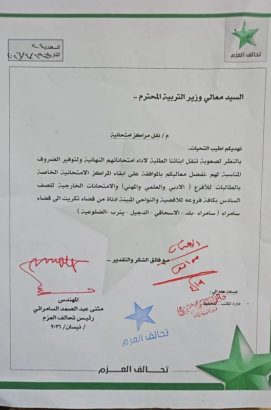 وتضمّن الطلب الموافقة على استمرار عمل المراكز الامتحانية الخاصة بالطالبات لفروع الدراسة (الأدبي، العلمي، والمهني)، إلى جانب الامتحانات الخارجية للصف السادس بجميع فروعه، في أقضية ونواحي سامراء وبلد والإسحاقي والدجيل ويثرب والضلوعية، بدلًا من نقلها إلى قضاء تكريت.