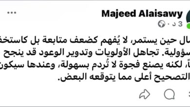أعرب مجيد العيساوي، صهر خميس الخنجر، عن استيائه من استمرار الإهمال وتراجع الالتزام بالوعود، ملوحا بالانسحاب من حزب السيادة. وقال…